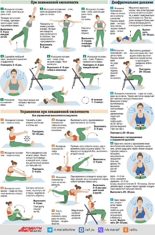 «Лечебная гимнастика при гастрите улучшает кровообращение в брюшной полости и укрепляет мышцы пресса, что способствует нормализации секреторной и двигательной функций желудка, — рассказывает заведующий отделением амбулаторной реабилитации Сеченовского университета Вячеслав Ушаков. — Нагрузка подбирается в зависимости от вида заболевания. При пониженной секреторной функции желудка требуется умеренная физическая нагрузка в среднем темпе, с небольшим количеством повторений. Это позволяет мягко усилить приток крови к стенкам желудка. При повышенной кислотности нужно выполнять более сложные упражнения в медленном темпе. Это оказывает угнетающее действие на пищеварение, выделение желудочного сока уменьшается, а кислотность понижается».